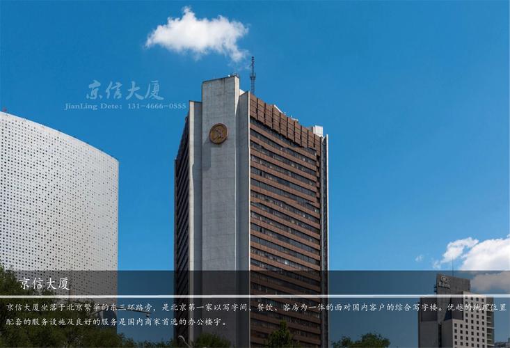 京信大厦经过十年时间的经营,在北京颇有知名度。它是北京第一家以写字楼、餐饮、客房为一体的面对国内客户的综合写字楼。优越的地理位置,配套的服务设施及良好的服务是国内商家首选的办公楼宇。基础设施配套完善,并有银行、邮局、购物中心、员工餐厅、浴池等配套服务。停车方便,住户免费停车,宽带已入户。写字楼位于东三环核心商务区,紧邻燕莎商圈,区域内有南银大厦、北京发展大厦、幸福大厦等一大批中高档写字楼和众多的商业、文化、娱乐设施,上午气氛浓郁,工作和休闲极为方便。
